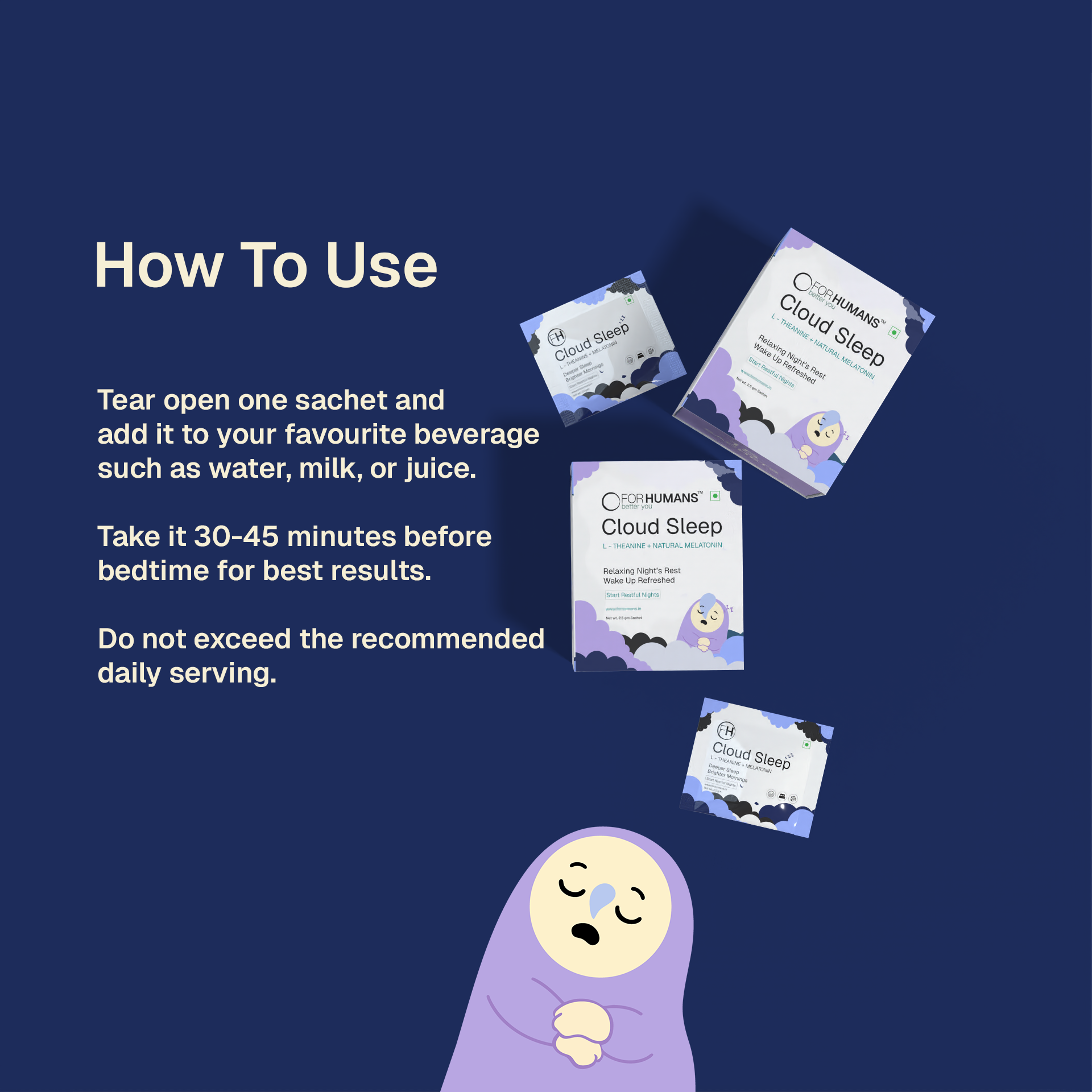 Cloud Sleep combines melatonin and L-theanine to help you fall asleep more easily and enjoy better rest. Melatonin signals your body to prepare for sleep, aligning your natural sleep rhythm. L-theanine supports relaxation by calming the mind and promoting drowsiness. Taken 30–60 minutes before bed, this blend gently eases you into a restful night, making it a reliable part of your evening routine. Formulated within Indian regulatory guidelines, Cloud Sleep offers a safe and effective way to support quality sleep and wake up refreshed.